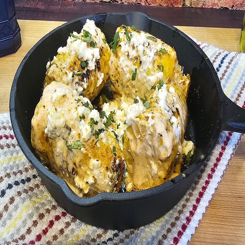 - This is an optional step but highly recommended. Using a skillet or cast iron pan, place the corn on med high to high heat. Allow to sit until you start to hear crackling noises. Turn a ¼ turn at a time until you have rotated the corn fully.