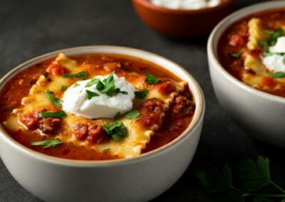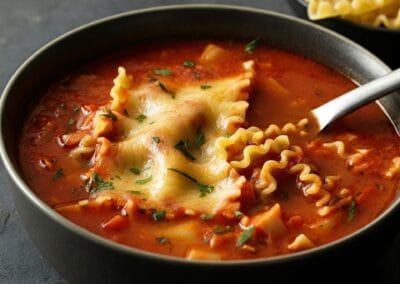 Simmered with garlic, Italian herbs, and a splash of cream, this soup delivers layers of flavor without the layering. Topped with a generous dollop of ricotta, mozzarella, and Parmesan, each spoonful is cheesy, cozy perfection.