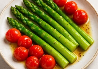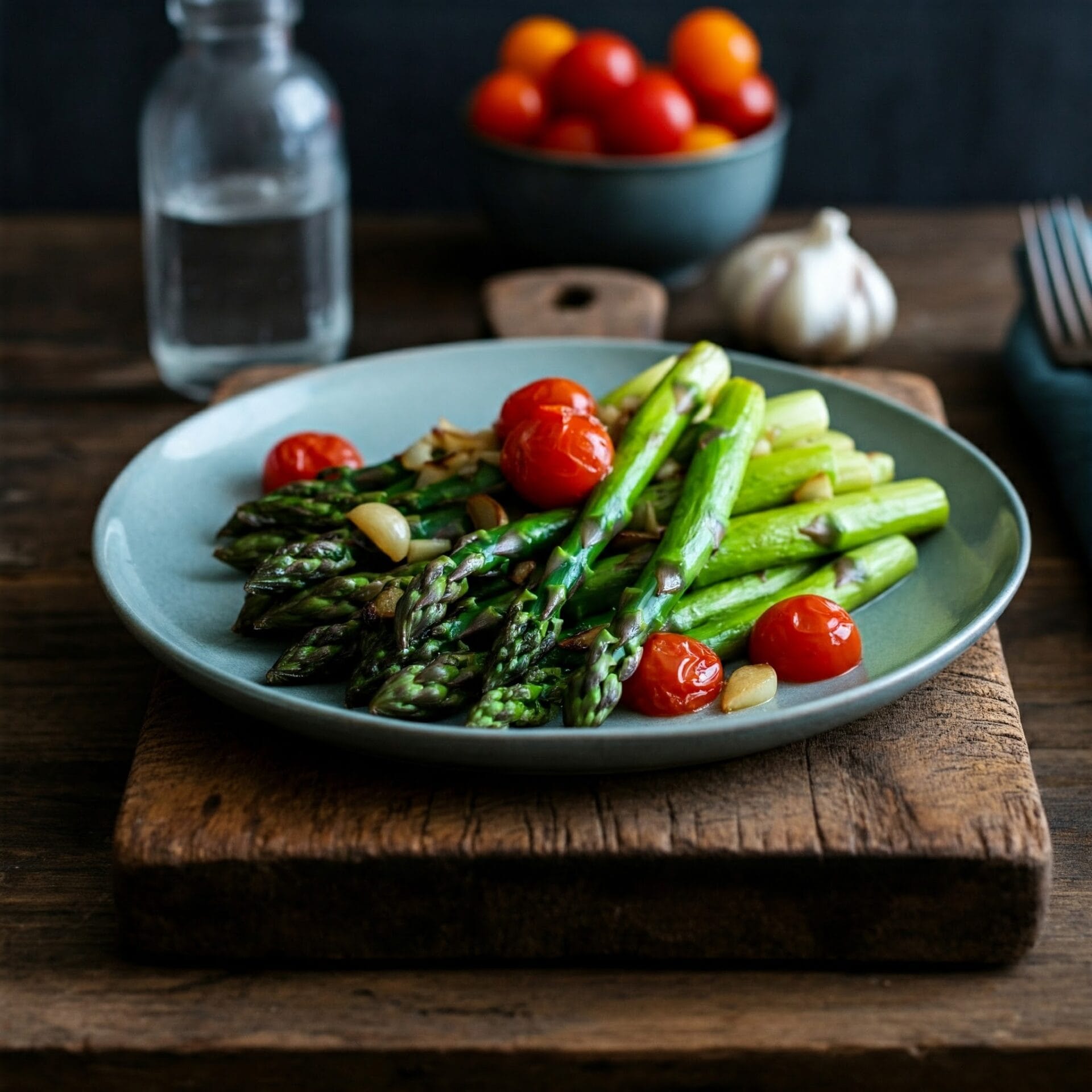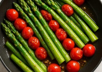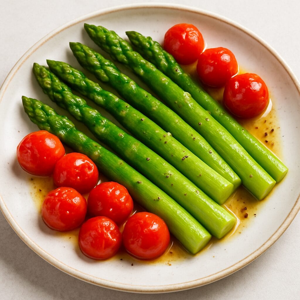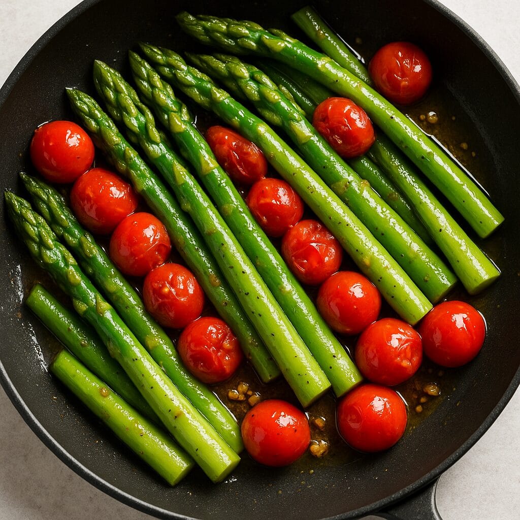 This Sautéed Asparagus with Garlicky Burst Tomatoes is a quick and vibrant side dish that delivers big flavor with minimal effort. Crisp-tender asparagus spears are sautéed until just golden, while juicy cherry tomatoes burst in the pan, creating a light, savory sauce. Fragrant garlic is added at just the right moment to deepen the flavor without overpowering the dish. Finished with a drizzle of olive oil, a pinch of salt, and freshly cracked pepper, this simple yet elegant recipe is the perfect complement to any main course — from grilled meats to pasta or seafood.