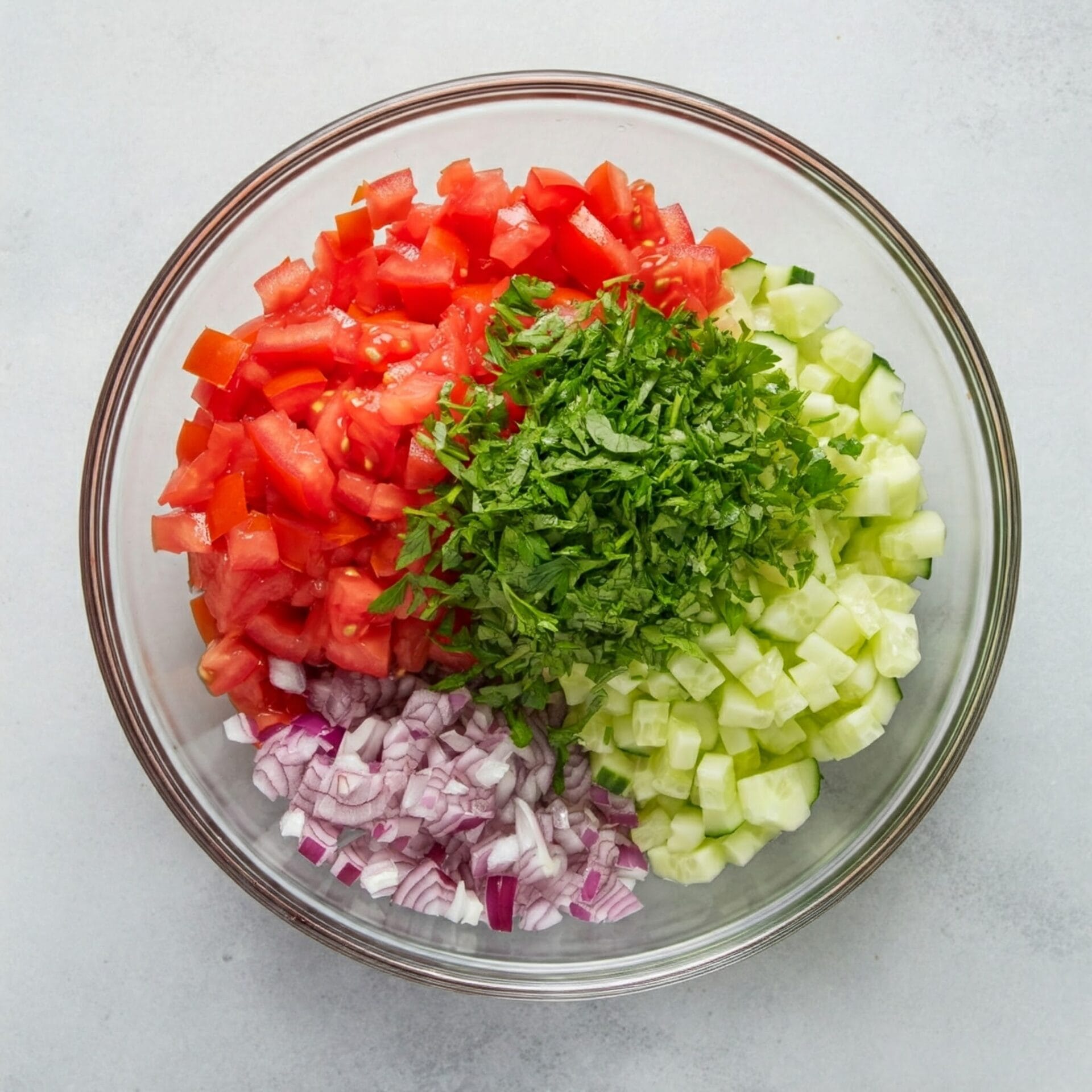 - In a large bowl, combine the prepared salad ingredients: diced tomatoes, diced cucumbers, chopped red onion, and parsley.3 Roma Tomatoes, ½ red onion, ¼ Cup Parsley, 3 English Cucumbers