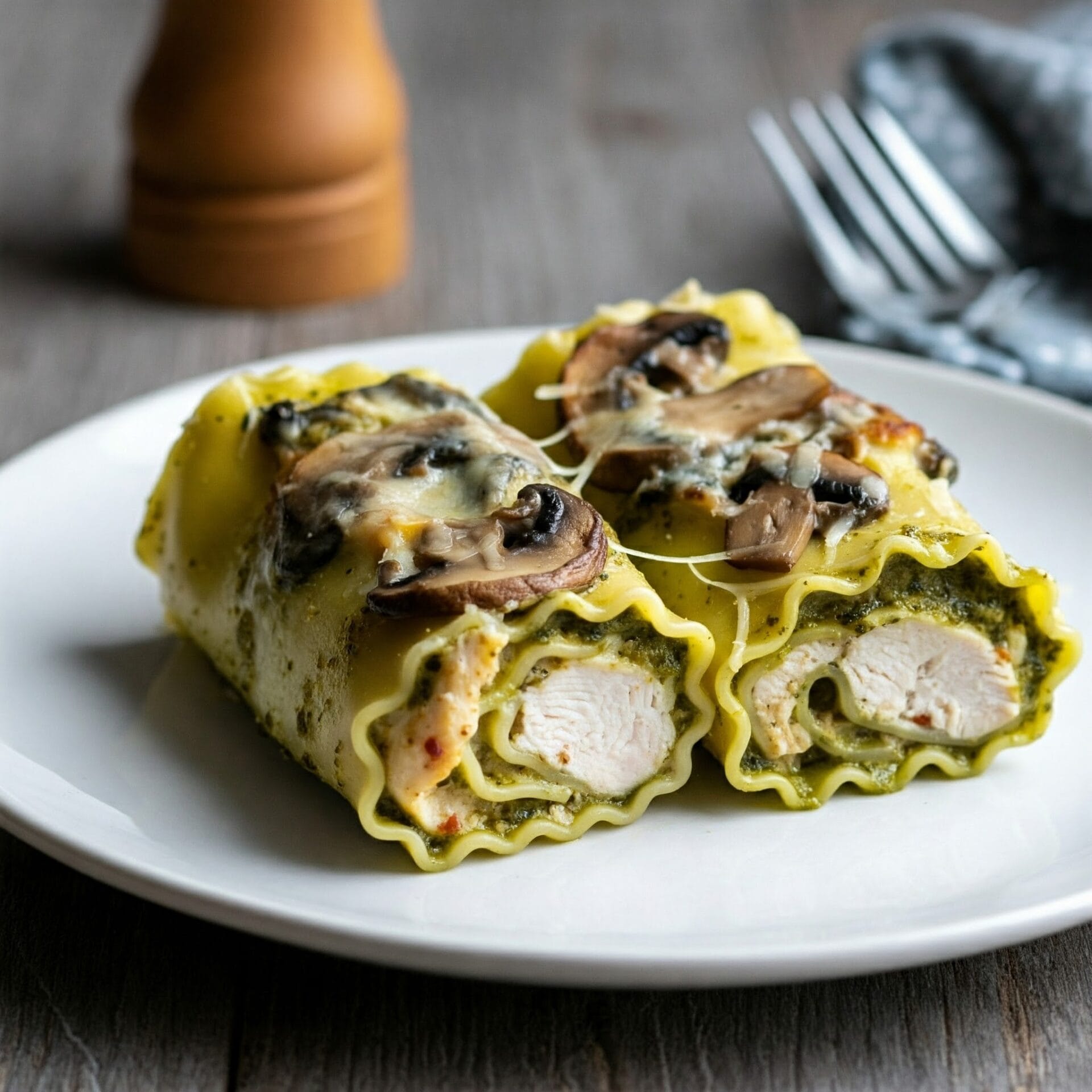 Pesto Chicken & Mushroom Lasagna Roll-Ups